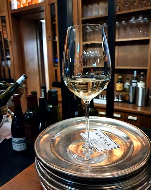 Tunnelmallinen look-a-like -matka pariisilaiseen bistroon. Kuten nimi kertoo, vanhan apteekin miljöö luo puitteet. Viinilehden vuoden viinibaariksi 2020 aateloima paikka on maistamisen arvoinen. Suosio on huima ja suhina sen mukaista. Viinilista on Eurooppaan suuntautunut. Burgundia ja Saksan Rieslingiä on saatavilla huipputuottajilta. Fiiniä ruokaa löytyy myös, mutta hirveän nälkäisenä ei kannata tulla. Annokset ovat hyvin kepeitä, mutta makumaailmaltaan loistavia.