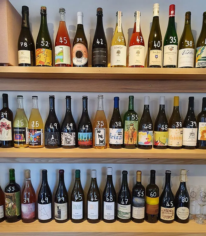 Huikea valikoima natuviinifaneille. Toki löytyy myös perinteisempää laatua. Laseittain saatavilla vain muutama merkki, mutta pullohinnatkaan ei ole mahdottomia, joten porukka kasaan ja maistelemaan.